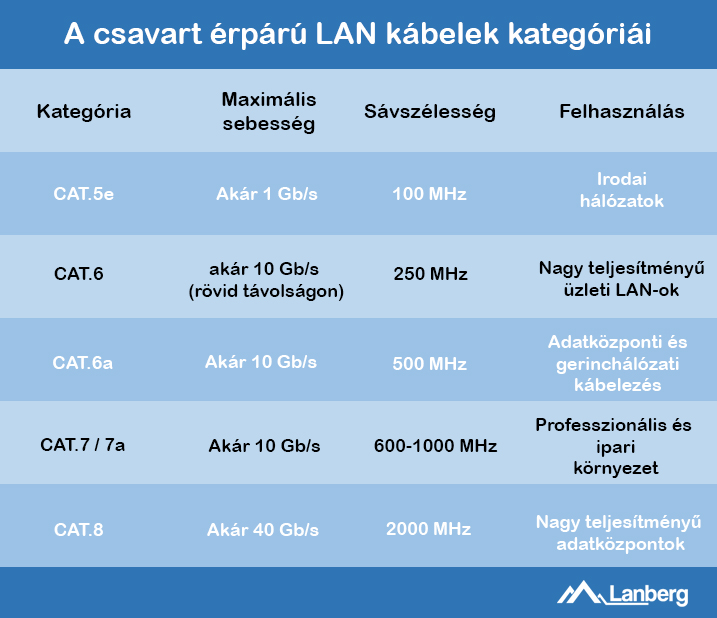 A LAN-kábeleket kategóriákba (CAT) sorolják, amelyek mindegyike meghatározza a kábel sebességét és sávszélesség-kapacitását. Íme egy rövid összehasonlítás: