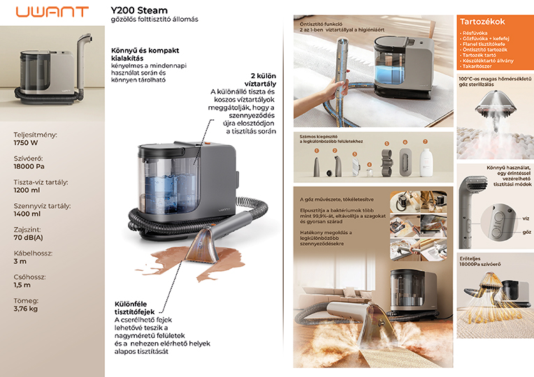 Kompakt megoldás a foltmentes élethez! A Uwant Y200 egy könnyű, mégis nagy teljesítményű folttisztító, amelyet gyors, mély és könnyű folttisztításra terveztek. A 18000 Pa szívóerővel könnyedén eltávolítja a kanapékból, matracokból, autóülésekből és kárpitokból a mélyen beivódott szennyeződéseket. Öntisztító rendszere és integrált tiszta és szennyezett víztartálya egyszerűsíti a karbantartást, míg az ultrakönnyű, csupán 3,76 kilós készülék könnyen hordozható és bárhol könnyen üzemeltethető.